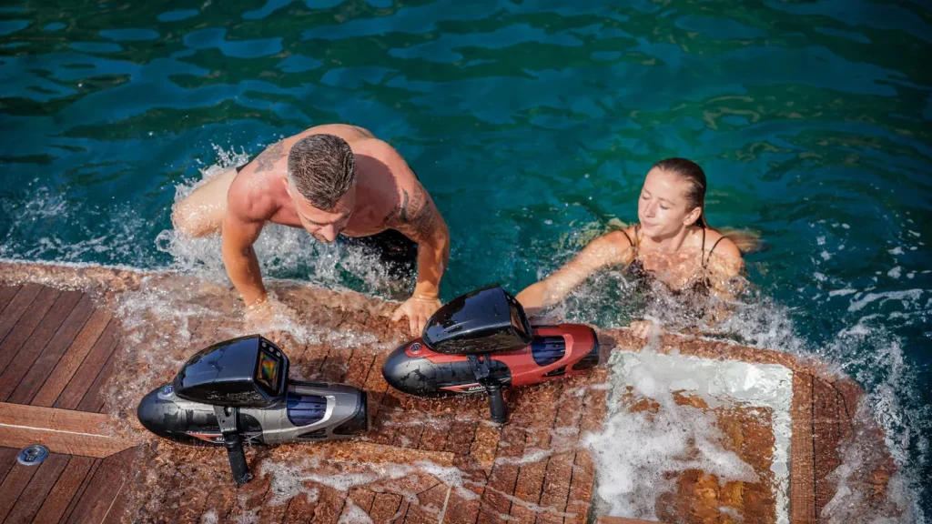 While the Navbow+ is known for agility and camera mounting, and the TINI for modular portability, the VAPOR is about raw performance and prestige. Against competitors such as the Seabob F5S, the VAPOR offers nearly identical propulsion feel at a fraction of the size and cost – making it a practical choice for resorts and private owners who want luxury-level thrills without luxury-level logistics.