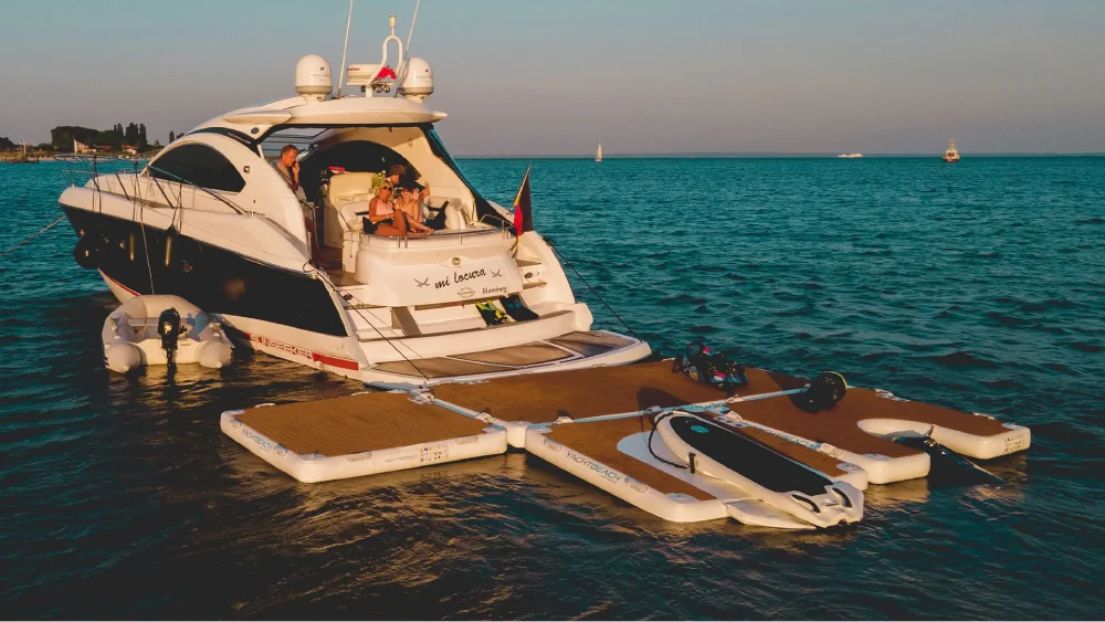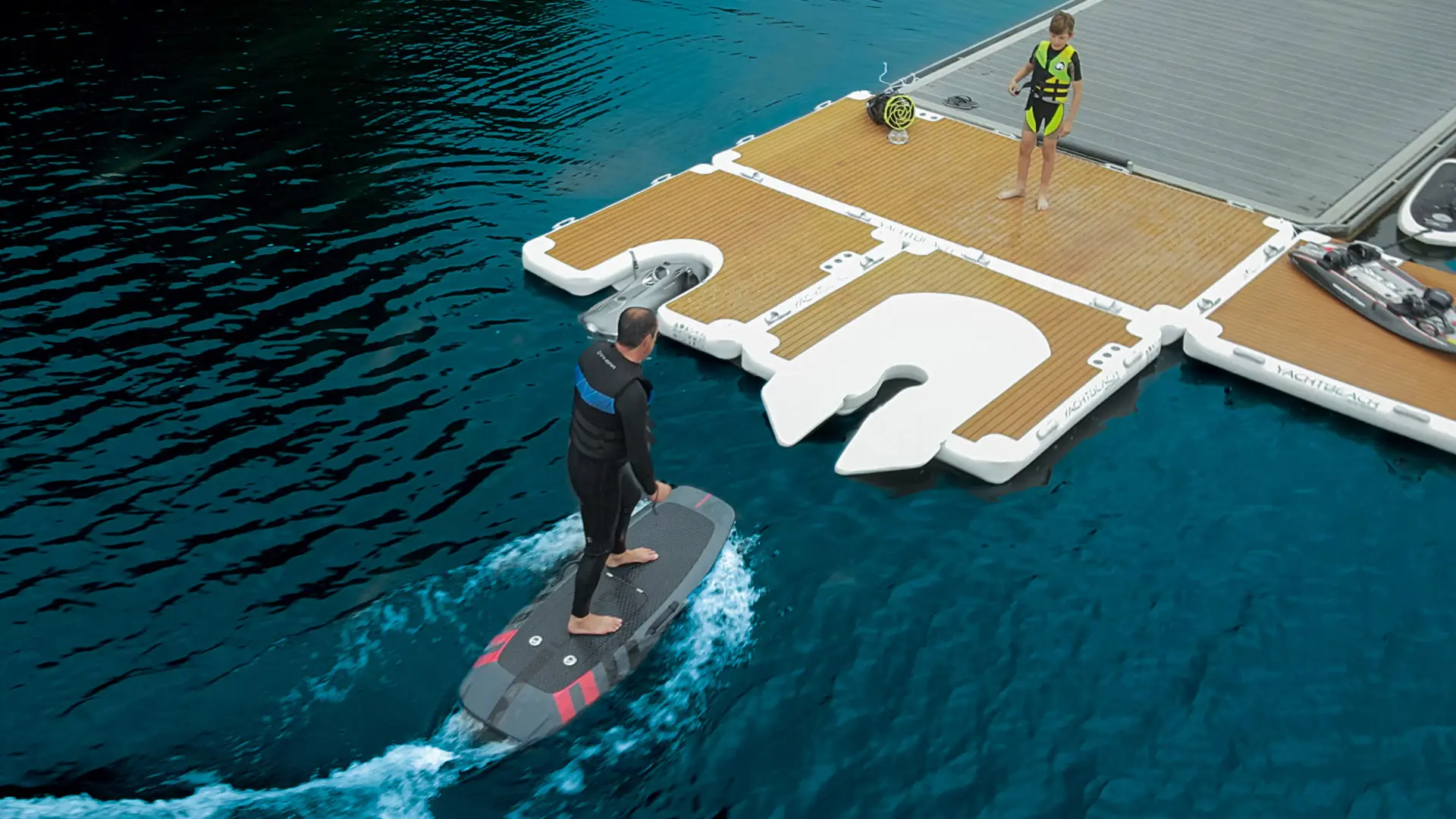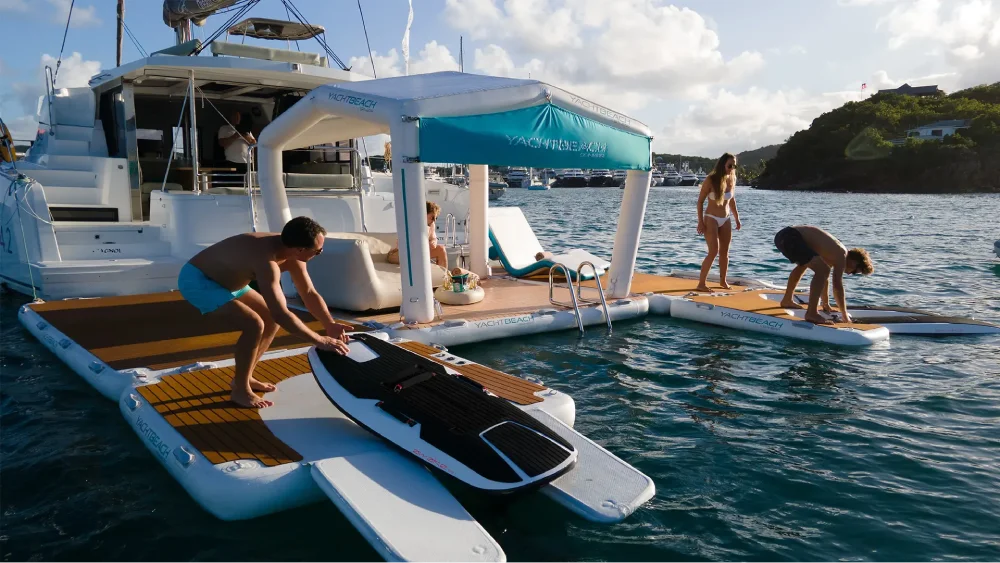 Stable inflatable dock for PWC, toys, and tender access.